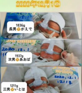 出産は33週での計画帝王切開。肺が未熟かもしれないと言われ「産声を聞かせてくれるかな?」と不安でしたが、3人とも元気な声をあげ、涙があふれたといいます。