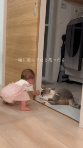 投稿された動画は、1歳2ヶ月の娘さんと猫のもちくんが床で一緒に遊んでいる様子を撮影したものです。