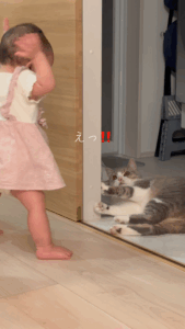 愛猫と遊んでいた1歳娘 しかし次の瞬間…!?娘の予想外の行動に「猫が一番ビックリしてる」「あれれ!?」「格の差見せ始めたか」