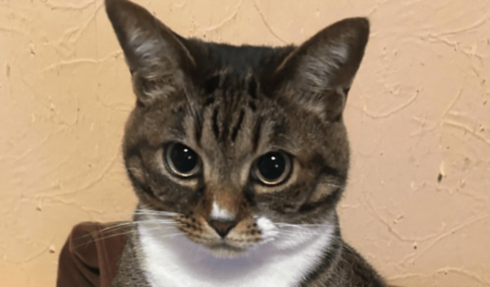 どっしりとお座りして飼い主を見つめる猫 しかし、よく見ると…!?「良くお似合いです」「昭和感ある」