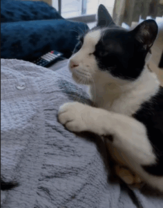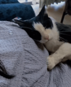 1ヶ月半が経ったある日、膝に突然乗ってきたのは、実家で生活する猫のれおんくん(8歳)でした。