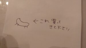 そこには、ウインナーの下から4本の爪楊枝が生えたようなイラストに「これ買ってきてください」というメッセージが添えられていました。