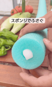 やり方としては、プールスティックに穴をプスプスと開けた後、片方をスポンジで塞いで反対にホースを差し込むだけ。