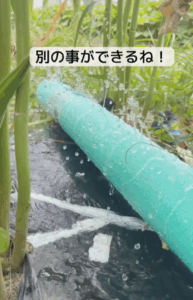 しかしこの水まきパイプを置くだけで、畑全体に均等に水が広がるように。