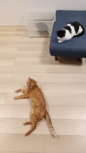 ぐいちゃんと一緒に暮らすのは、白黒猫のなっつちゃん(8歳)と茶トラ猫のはるちゃん(5歳)。