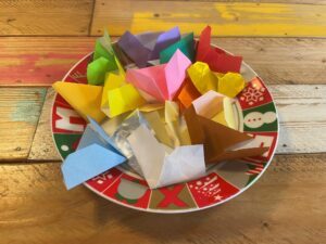 他に何か作っているモノがあるか尋ねると「お絵描きが好きで、いつもいろいろな色を紙に描いて『虹~!』と言っています。また、セロハンテープにハマっているようで、ずっと触っています」と、娘さんの普段の様子を教えてくれました。