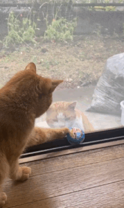 すると、その子猫が網戸越しに若林くんを呼びかけ、まるで「一緒に遊ぼう」とボール遊びに誘導。