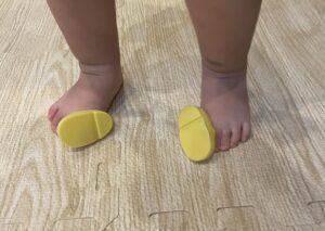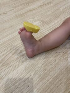 ママさんの真似をしながら、愛情たっぷりに人形のお世話をするようになり、その延長で人形の靴を履いたようです。
