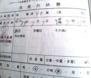 母子手帳の出生日時が記されたページ(@soreike_nanaemonさんより提供)