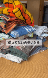 投稿の内容は、長年使っていない大量の布をリメイクする様子です。