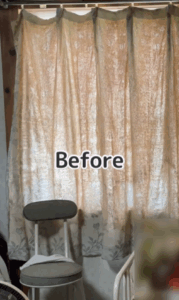 お義母さんの許可を得て、ボロボロのカーテンの代わりに布で新しいものを縫い直しました。