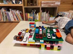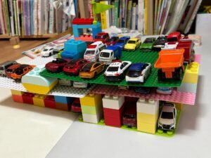 立体駐車場を再現する息子さんに対して「何かに集中している時は基本そっとしておいているので、気づいたら大きな駐車場ができていてとても驚きました!柱や入り口、車が所狭しと並んでいるところなど、よく再現できているなぁと感心しました」と@yoshiyoshi.haruさん。