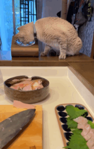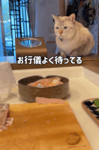 動画の撮影時「刺身にするよ」と声をかけると、くうくんはキッチンにやってきました。