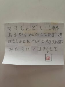 「ママしんどいし熱あるからねかしてあげて!みそしるとあげものとオクラあるよ。みたらハンコおして」