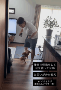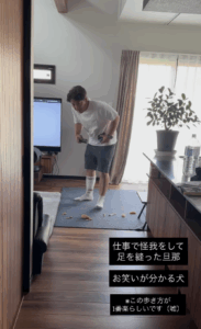 怪我でギプスをしている旦那さんの足元に、澪くんが体当たりする瞬間が映っています。