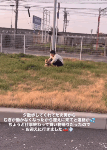 駆けつけたママさんの車を見つけた瞬間、むぎくんはすっと立ち上がり、嬉しそうな表情に変化しました。
