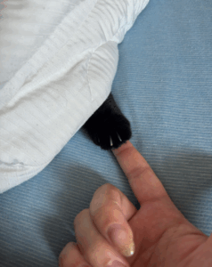 「前足だけ出して甘えてくるのもいじらしくて泣けてきます。せっかくなのでそのまま一緒に昼寝しました」