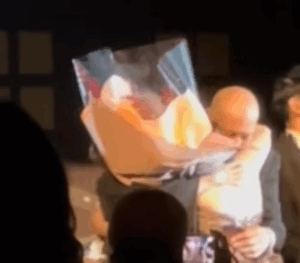 「感動したらめっちゃ泣くお父さんなので、母がせめて笑いに変えようと持って行ったそうです」と、経緯を話します。