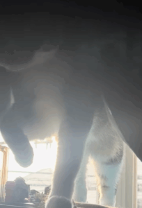毎朝、日の光が差し込み始める5時〜6時頃になると、まず数回「ニャー」と鳴き、反応がなければ出窓に飛び乗って前足でカーテンを開き、朝の光を部屋に取り入れます。