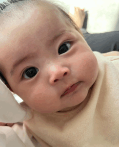 生後まもなくでも、穏やかな性格のなかにユーモラスな一面も見せてくれる娘さん。
