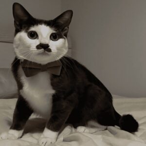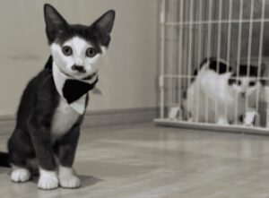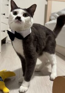 その後、家族となったプランスくん。タキシード柄が目立つようにと襟付きの蝶ネクタイをつけてみたところ、まさにタキシードを着ているような姿になりました。
