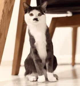もともとは保護猫だったプランスくん。@Saeroyi_catさんは、七三分けのように見える額の模様や、ちょび髭のような鼻周り、タキシードを着ているような柄に魅了され、一目惚れしました。