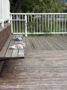 段差を降りると、そこにはベンチに佇む2羽の鳩が池を見つめていたのです。