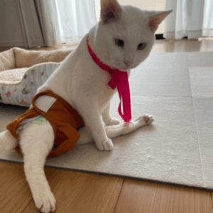 現在、スズくんは交通事故の影響で左脚の硬直があるため、3本足で歩行しており、おかげで腕と肩がムキムキでたくましい一面を見せます。排泄のコントロールが難しいためオムツをつけていますが、飼い主さんを後追いしたり、帰宅時には飛ぶように走ってお出迎えしてくれるなど、愛嬌たっぷりだそうです。
