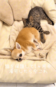 保護してから1ヶ月、安心したようにこころくんに身を寄せる姿に多くの人が癒されました。