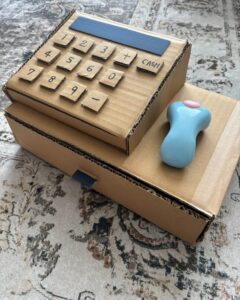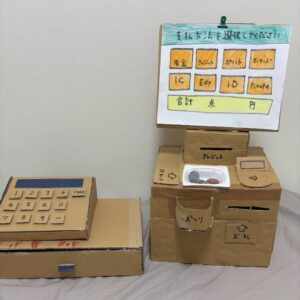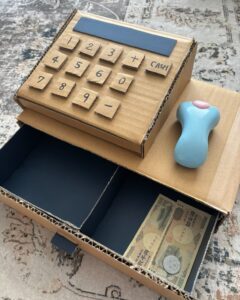 ママさんの手作りレジスターは、お店屋さんごっこで大活躍です。
