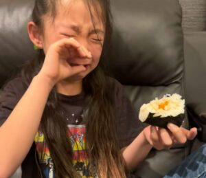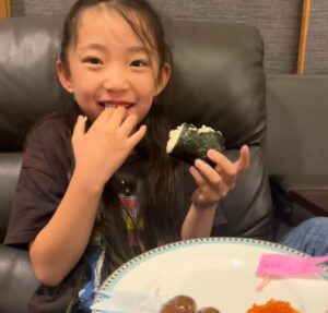何度か食べたあとに、チラッとおにぎりを見てみると、中身がイクラということに気づきました。娘さんは驚き、嬉しそうに「女の子…」とつぶやきます。