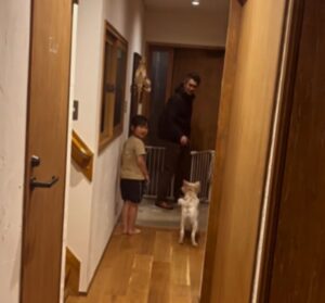 玄関へ行くと、尻尾を振りながらパパさんを出迎えます。