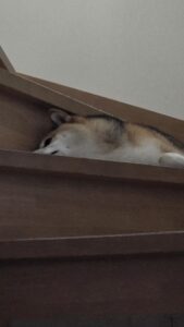 夏は階段、冬はこたつの中にいるそうで、特にクーラーの効きすぎない階段がお気に入りとのこと。