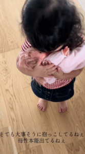 生後4ヶ月息子を抱っこするママ すると2歳娘がしてきた行動に「お母さんと同じ」「可愛いね」