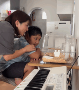 「息子は毎日ケージの掃除や餌やり、水交換を行なってくれています。ハムスターもすっかり慣れてくれて息子の手に乗ってくれるようになりました」と、ぷりんちゃんも懐いている様子。