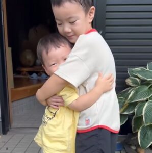 靴を履いているお兄ちゃんを見て、弟さんは声を出して笑います。お兄ちゃんは弟さんのところまで来ると、手を広げて抱きしめ、顔をくっつけました。