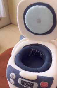 内釜は取り出すこともでき、中にぬいぐるみ用のペレット(ぬいぐるみの中に入れるビーズのような詰め物のこと)を入れると、より本物の炊飯器のように見えます。
