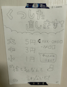 小学6年生の娘さんはある日思い立ち、新しい商売を始めました。張り紙には「くつした直します!」と書かれ、価格は大5円、中3円、小1円と表示されています。
