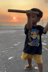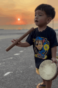 次男くんは、突然「エイサーしたい!!」とパーランクーとバチを持ち、夕陽をバックに踊りだしたそうです。