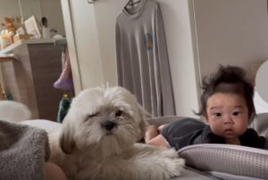 朝、ママさんが目を覚ましてふと足元の方を見ると、0歳の息子さんとマルシーズーのイヴくんが同じような姿勢でママさんの方を見ていました。あまりのかわいさに、寝ぼけながらもすぐにカメラに収めたというママさん。