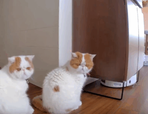 外出先でスマートフォンに「お掃除ロボが引っかかって動けません」と通知が届き、飼い主さんはペットカメラで確認。猫ちゃんたちは引っかかった掃除機をじっと見つめていました。