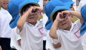 ママさんがカメラを向けていると、ママさんを見つけてハートのハンドサインを送ってくれた息子さん。その様子はまるでアイドルのファンサービスのよう。