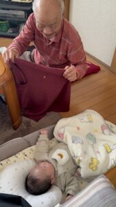 息子さんも、じーっとひいおじいちゃんの服を見ていました。