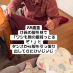 おそろいの服を見せるひいおじいちゃん(@tsumu007さんより提供)
