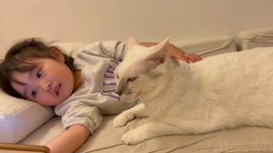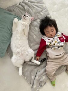 パッと見ると気付きにくいのですが、さくくんは娘さんの横で気持ちよさそうに眠っています。とてもかわいらしい様子ですね。