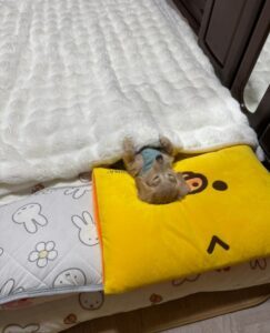 前足だけ少し出して、掛布団を掛けている來優ちゃんの愛らしい姿が、写真からも伝わってくるでしょう。