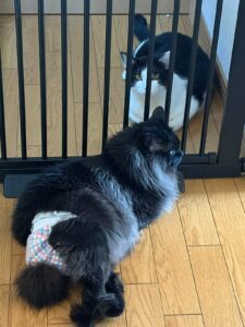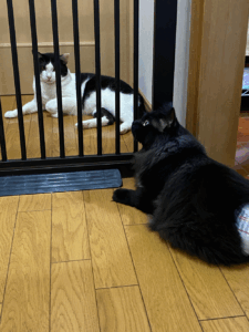 最初、慈々くんは距離を置いて静かに見守っていましたが、安蘭くんの回復とともに縄張り意識が強まり、現在は安蘭くんが2階、慈々くんが1階で過ごしています。