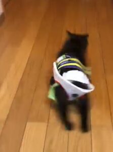 保護当初は下半身麻痺で後ろ脚はやせ細り、深い傷もありました。断脚の危険を感じますが、それでも日々リハビリと手当を続け、やがて自作の車いすで廊下を走れるほどに回復した慈々くん。