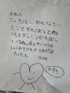 娘さんは、幼稚園に通っている頃からママさんが仕事でつらそうにしているときや、謝りたいときなどによく手紙をくれるとのこと。