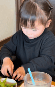 それでも息子さんはまだ2歳。海苔で上手に枝豆を包むも、口に運ぶのがうまくいかず、掴んでいる指ごと口に入れてしまいます。豪快に指ごと食べようとしているかのような姿に、思わず笑ってしまったのだとか。